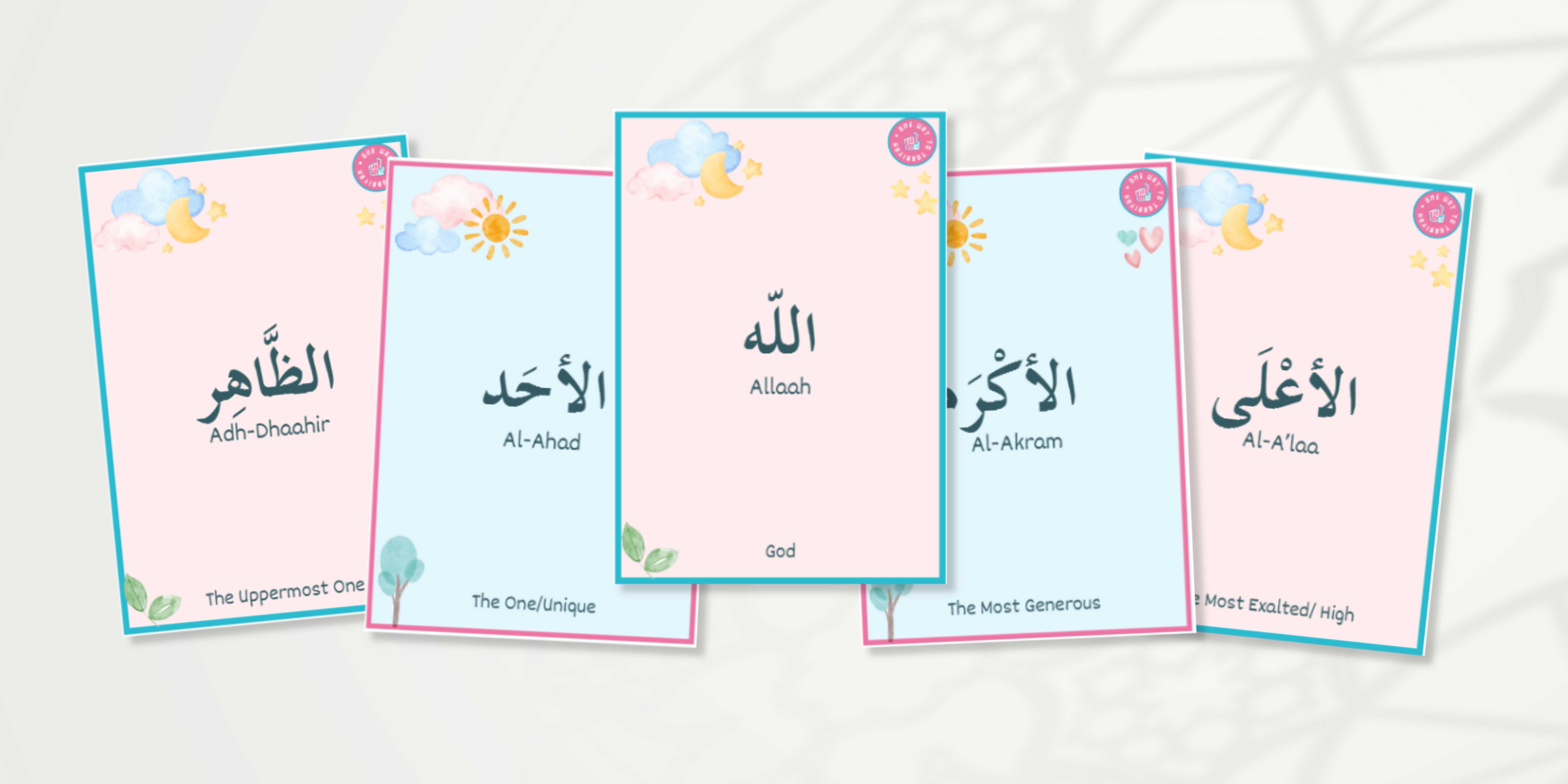 Delight your child with these cute, colorful flash cards featuring the Authentic 99 Names of Allaah, compiled by Shaykh Muhammad ibn Saalih al-Uthaymeen (rahimahullaah) from the Qur’aan (81 Names) and authentic Sunnah (18 Names) in his book Al-Qawaa’id al-Muthlaa.