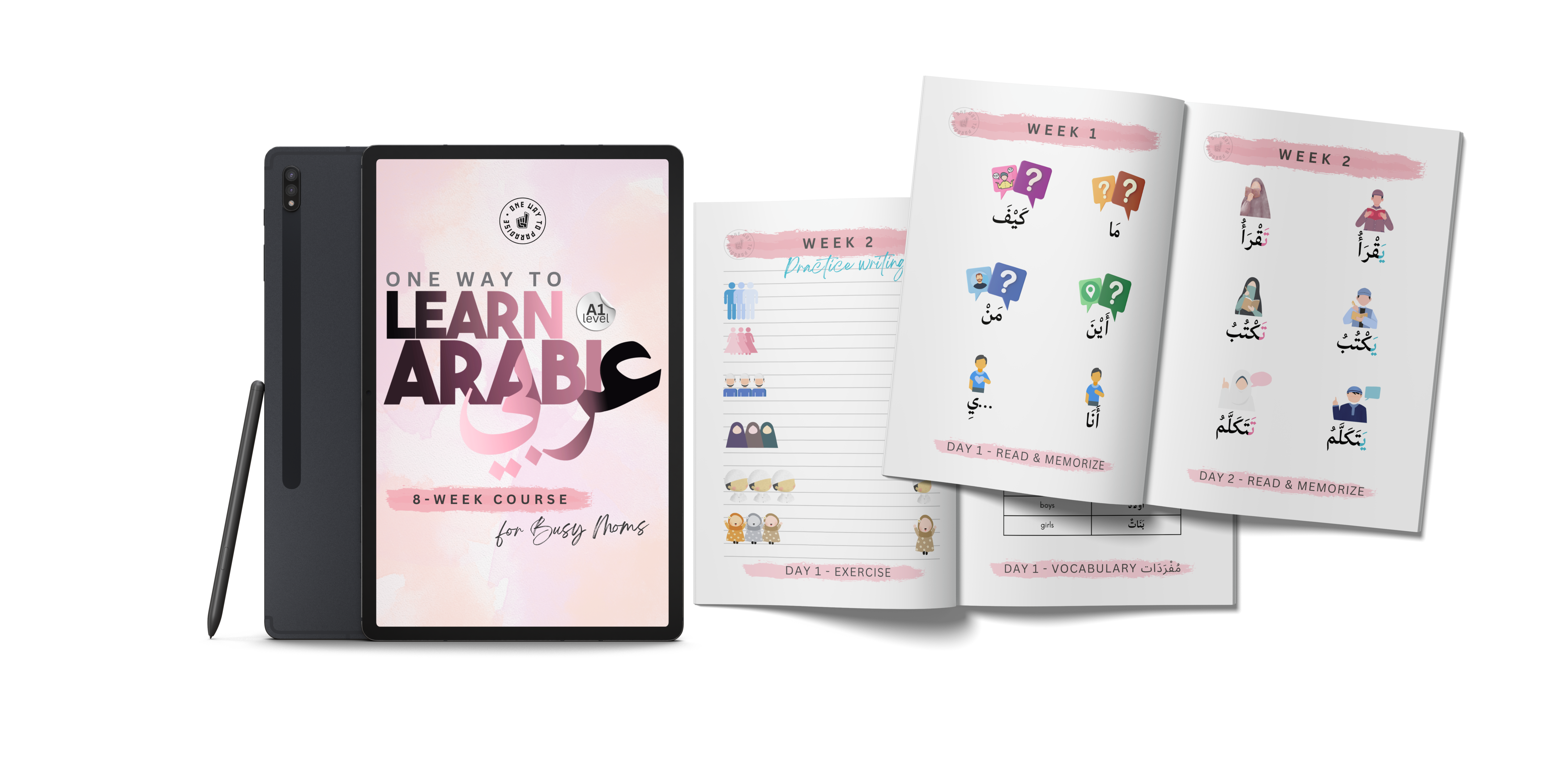 Our companion "One Way To Learn Arabic for Busy Moms Workbook" is your go-to tool for a comprehensive and structured learning experience. Available in a convenient printable PDF format, this workbook complements your daily lessons and live sessions. It contains the daily vocabulary you'll be learning, engaging exercises to reinforce your understanding, and dedicated pages for note-taking during the live sessions with our instructors.